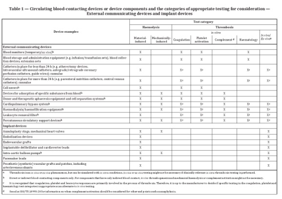 針對外部連通器械和植入器械,表格1列舉了與循環血接觸的常見器械或器械組分,并提供了可參考的測試類別。例如血液監測裝置,可考慮的測試包括:材料介導的紅血球溶解實驗,體外凝血、血小板激活及血液學實驗。